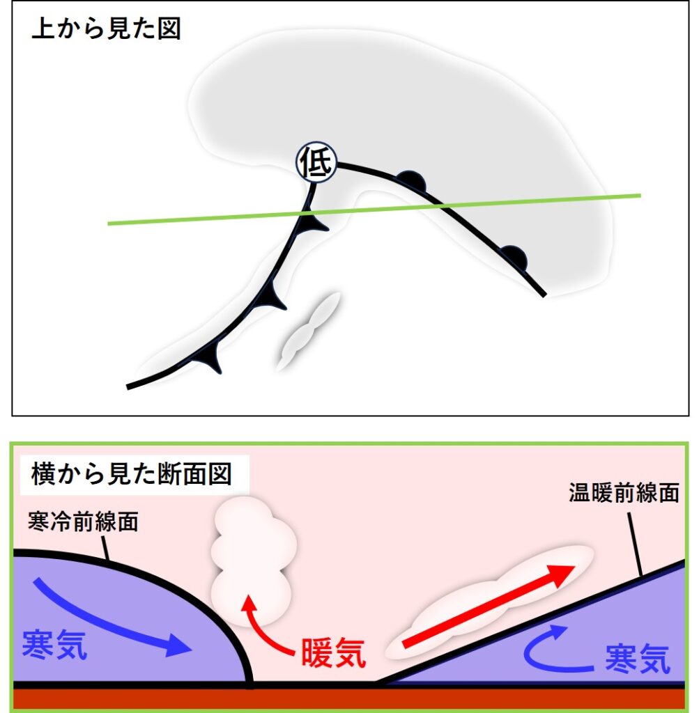 注)上段は、上から見た図。下段は地表面上にある前線に直交する向きに切った鉛直断面図(横から見た図)。上段の緑色の一本線と、下段の図を囲んだ緑色の線が対応する。