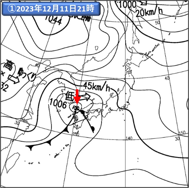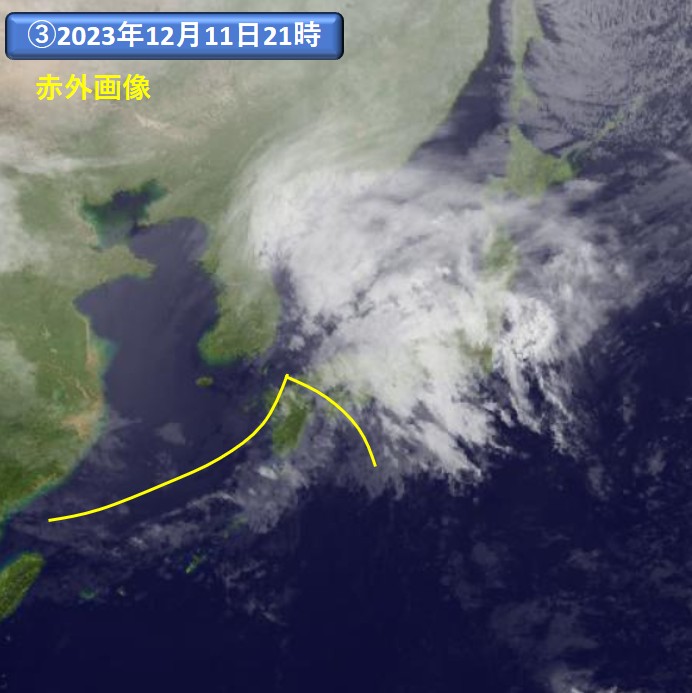 図10 2023年12月11日21時の地上天気図(①)、気象レーダー観測画像(②)、及び気象衛星による赤外画像(③)