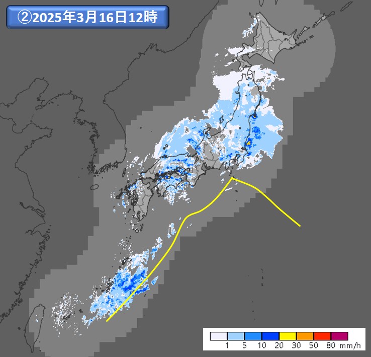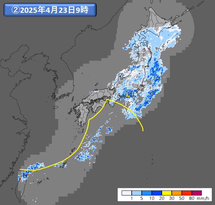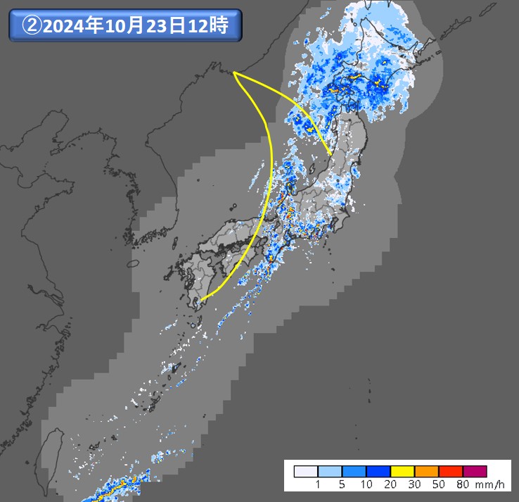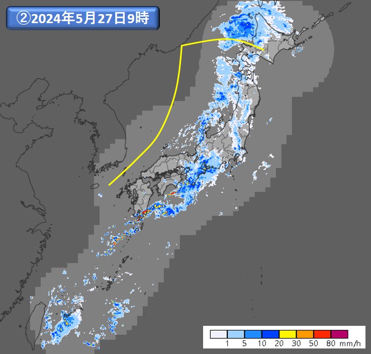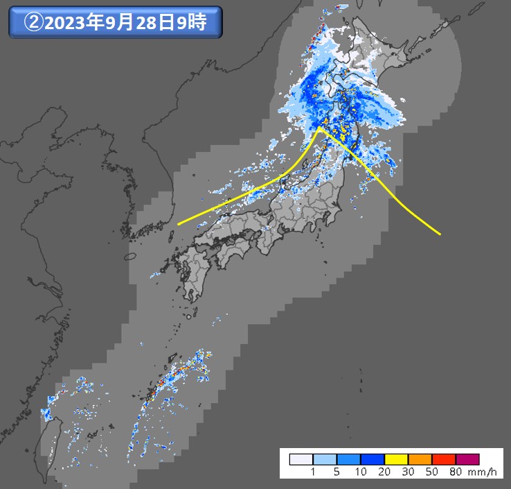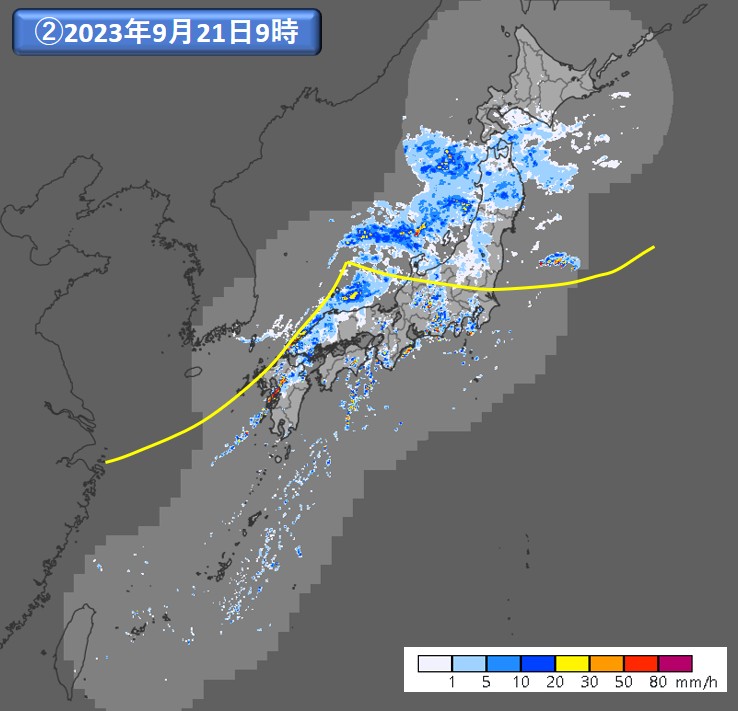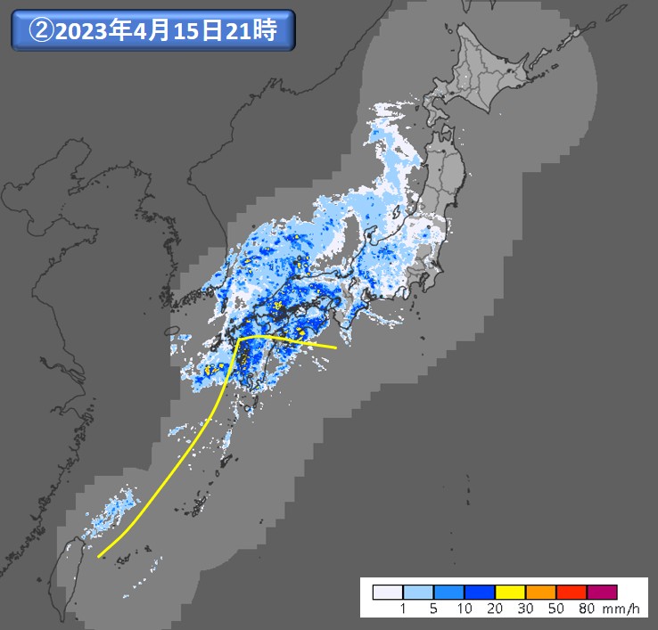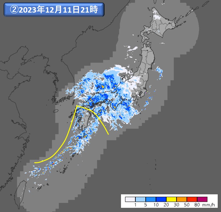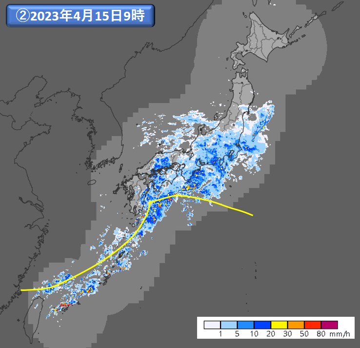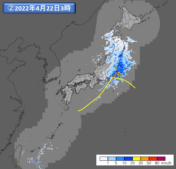さらに、22事例の温暖前線と寒冷前線付近の降水域をみると(図2~23の②)、温暖前線付近の降水域が広く、寒冷前線付近の降水域が狭い傾向を確認できます。