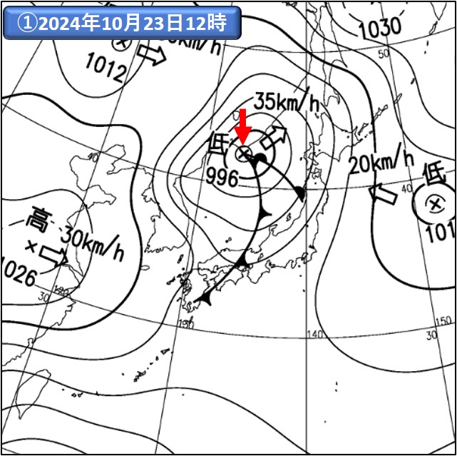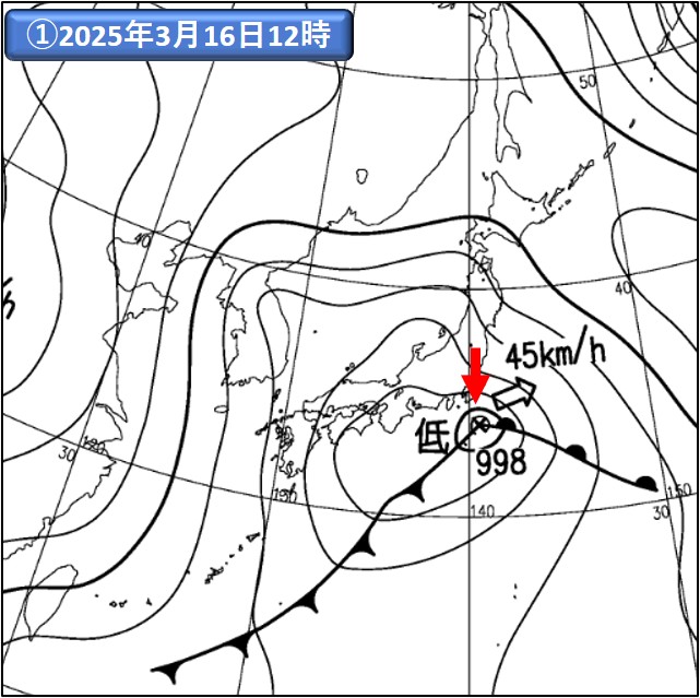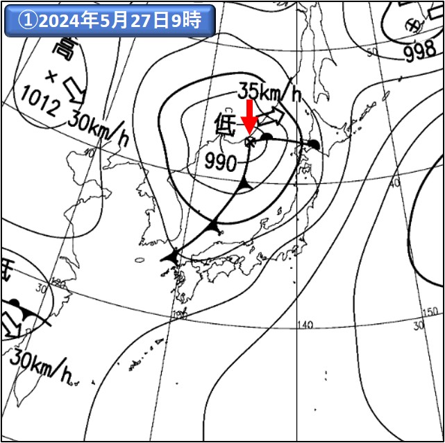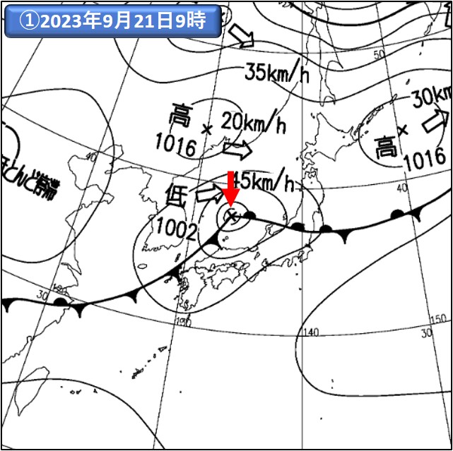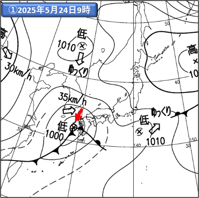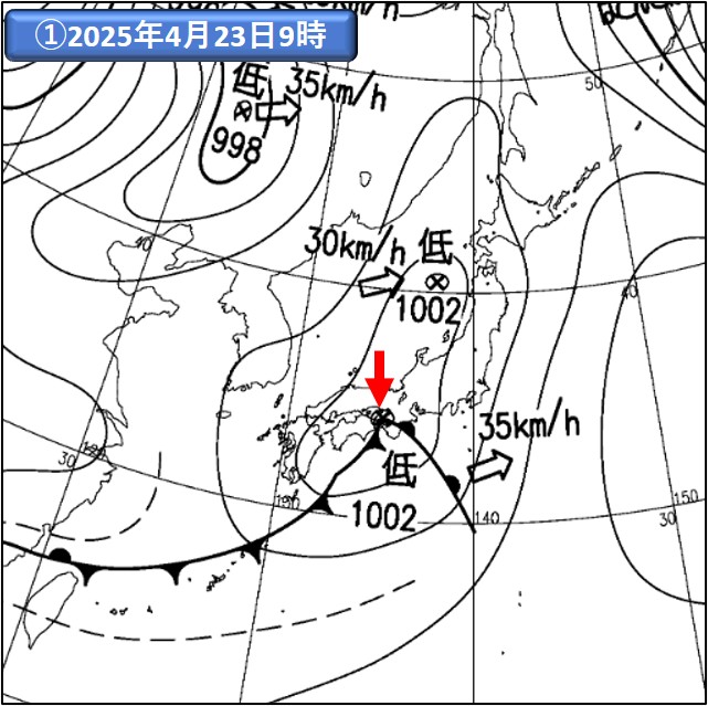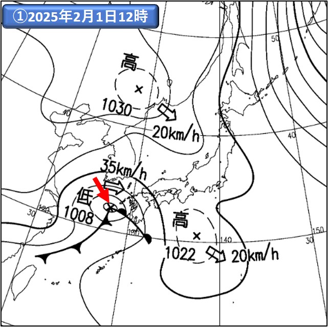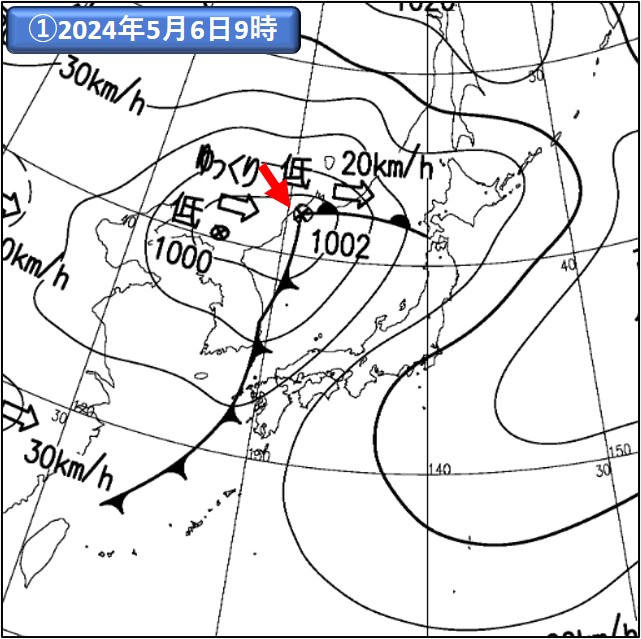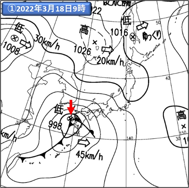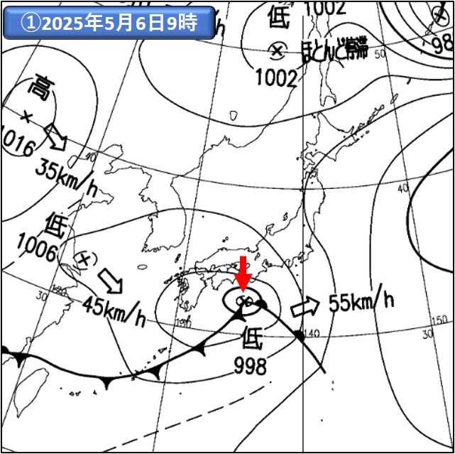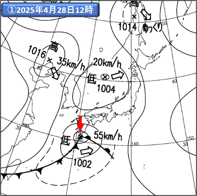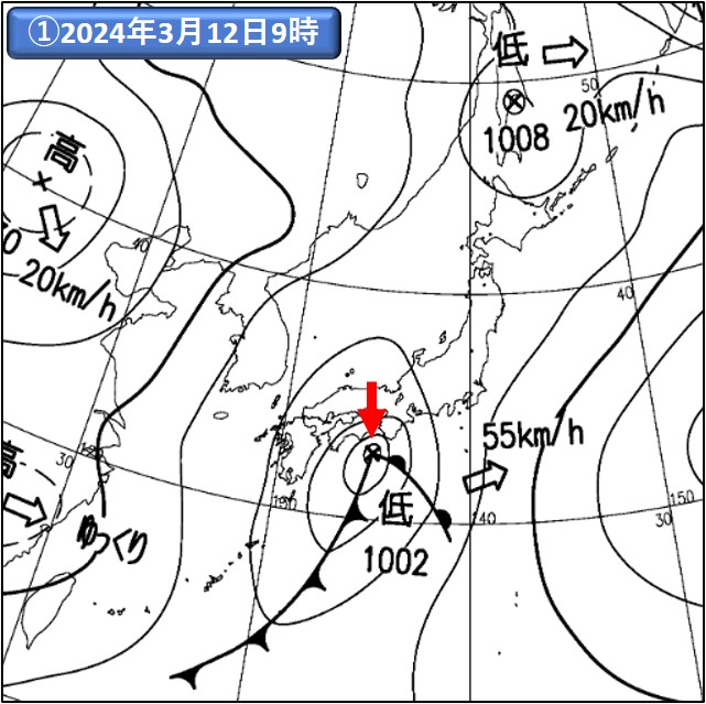 注)①は、気象庁提供の地上実況天気図(速報天気図)の一部を拡大した図。注目する低気圧に、赤の矢印を記入。②は、気象庁提供の気象レーダー(いわゆる雨雲レーダー)観測画像。レーダーから発射された電波が、降水粒子にあたってはね返ってきた電波の強さを降水強度に換算し、色を変えて表示。注目する温暖前線、寒冷前線のおおまかな位置を、黄色の実線で示した。③の画像は高知大学気象情報頁 (http://weather.is.kochi-u.ac.jp/) による。