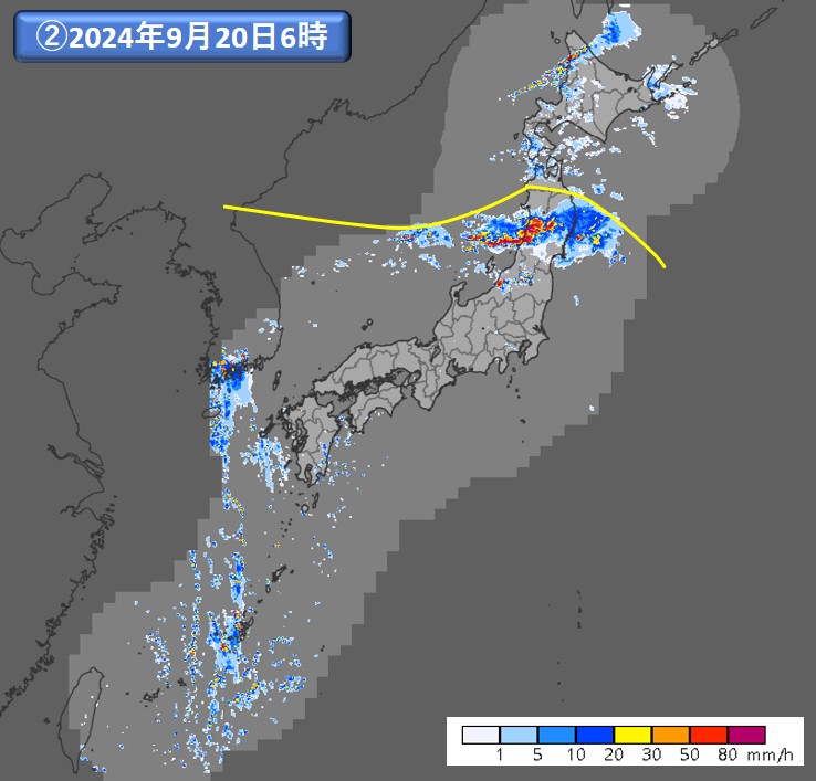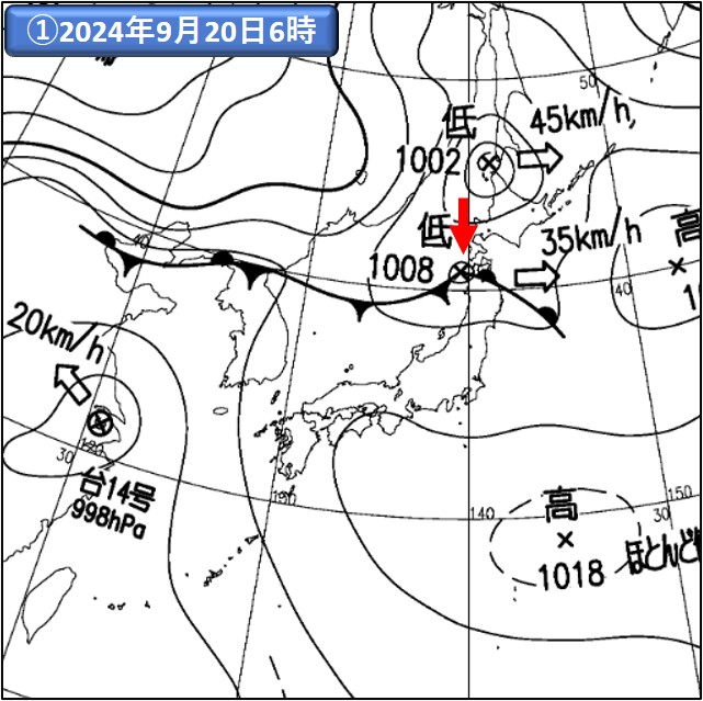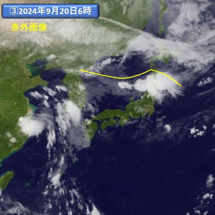 図15 2024年9月20日6時の地上天気図(①)、気象レーダー観測画像(②)、及び気象衛星による赤外画像(③)