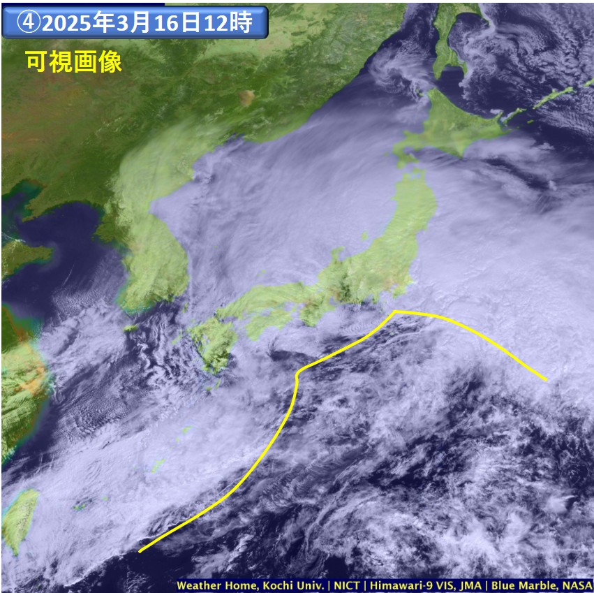 図18 2025年3月16日12時の地上天気図(①)、気象レーダー観測画像(②)、気象衛星による赤外画像(③)及び可視画像(④)