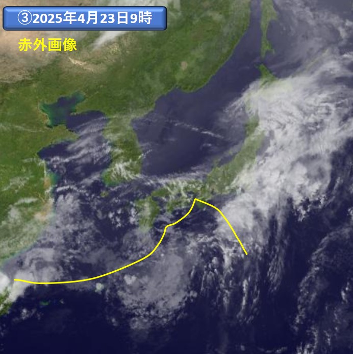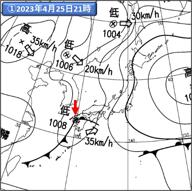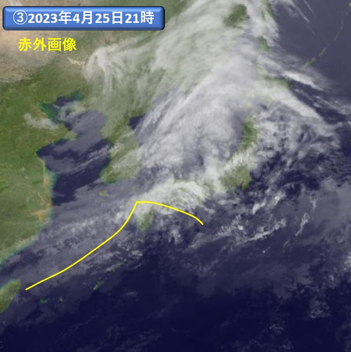 図7 2023年4月25日21時の地上天気図(①)、気象レーダー観測画像(②)、及び気象衛星による赤外画像(③)