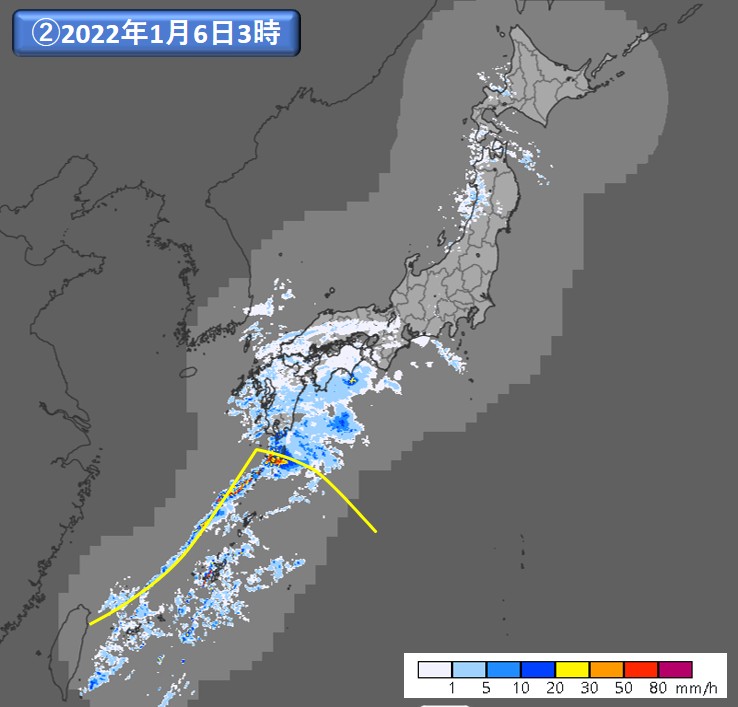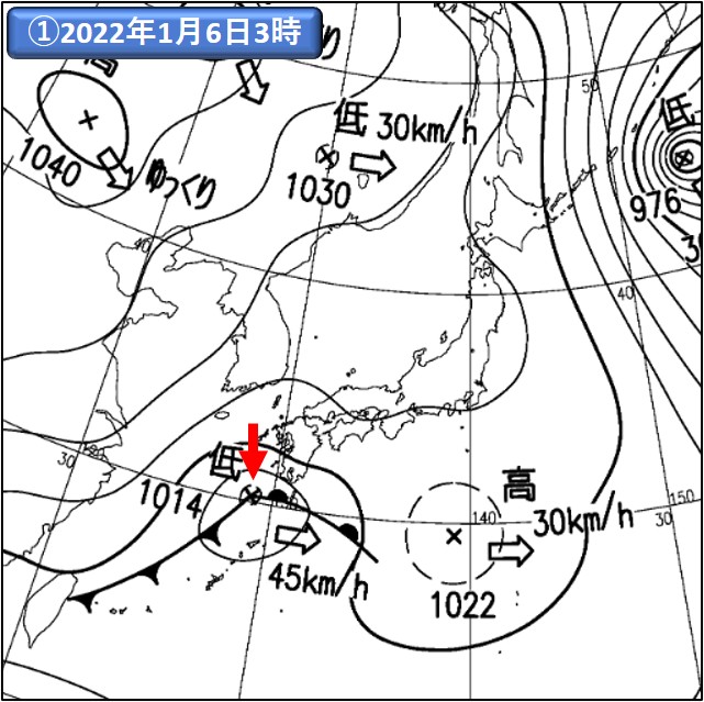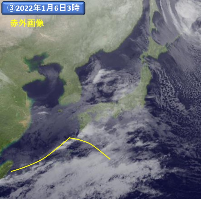 図2 2022年1月6日3時の地上天気図(①)、気象レーダー観測画像(②)、及び気象衛星による赤外画像(③)