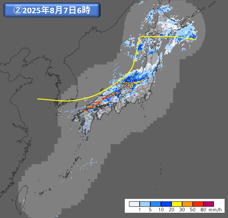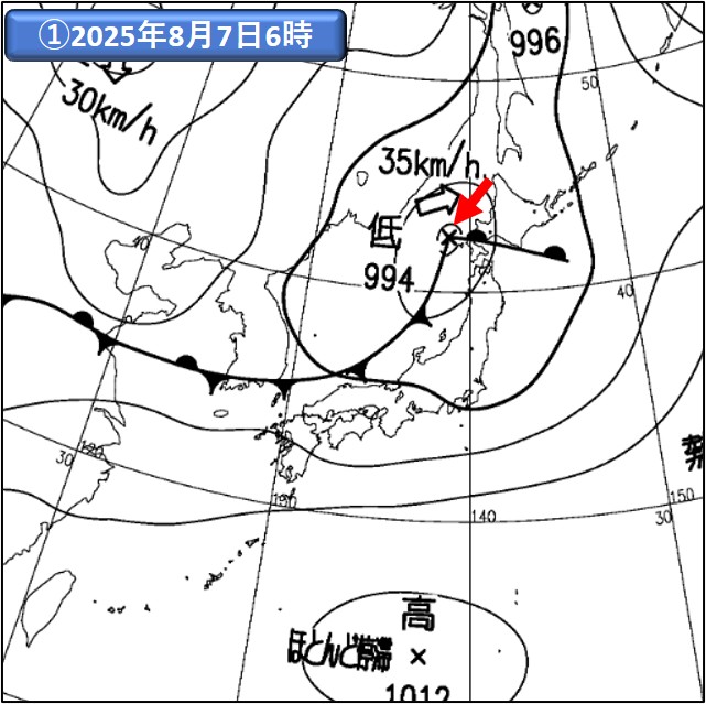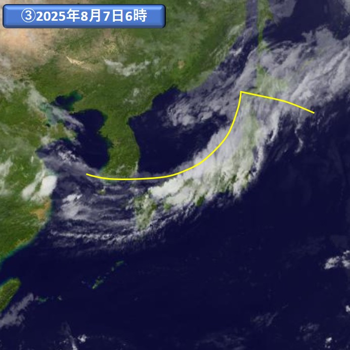 図23 2025年8月7日6時の地上天気図(①)、気象レーダー観測画像(②)、及び気象衛星による赤外画像(③)