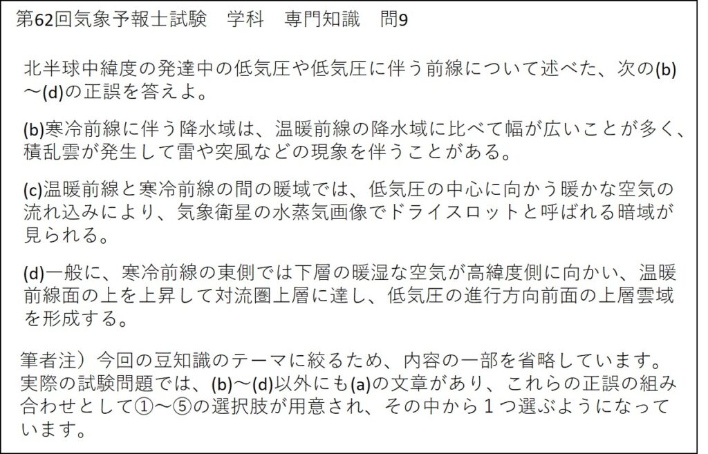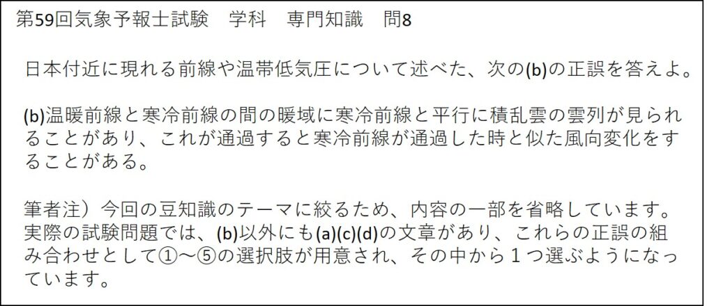 (b)に関しては、図1(上段)を用いて述べたとおり、暖域に寒冷前線と平行に積乱雲の雲列が見られることがあり、これが通過すると寒冷前線が通過した時と似た風向変化をすることがあります。よって、問題文(b)は、正しいです。