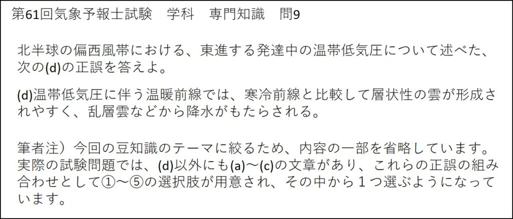 (d)に関しては、豆知識13及び豆知識37(図2上段)で述べたとおり、低気圧の前面(東側)では下層の暖湿な空気が高緯度側に向かって上昇しながら流入します。また、豆知識28(図25)や今回の豆知識の図1(下段)を用いて述べたとおり、暖気は、温暖前線面の上を上昇して上層雲域を形成します。よって、問題文(d)は、正しいです。