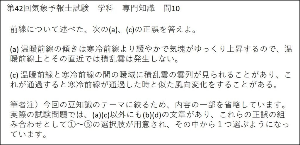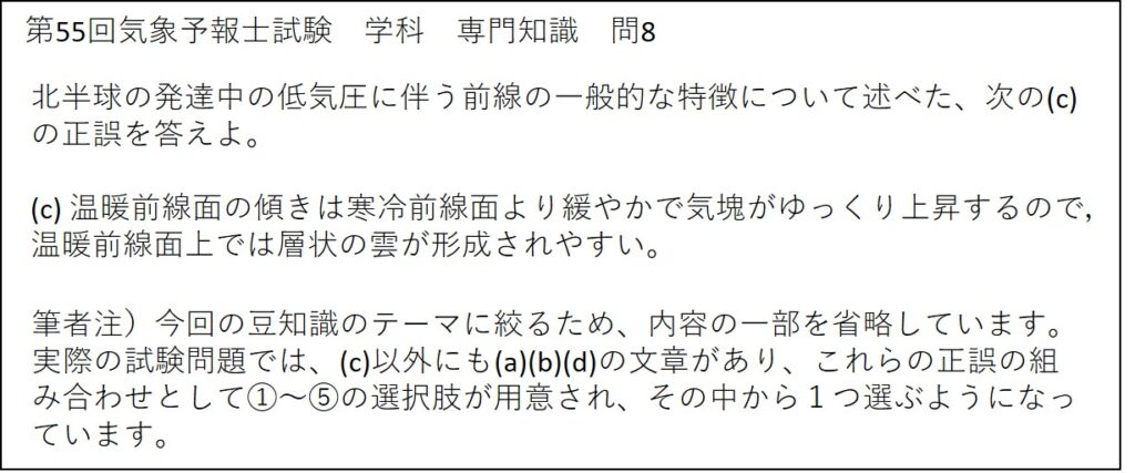 (c)に関しては、豆知識37の図2(下段)を用いて述べたとおり、温暖前線⾯の傾きは寒冷前線⾯より緩やかです。また、今回の豆知識の図1(下段)を用いて述べたとおり、温暖前線⾯上では層状の雲が形成されやすいです。よって、問題文(c)は、正しいです。