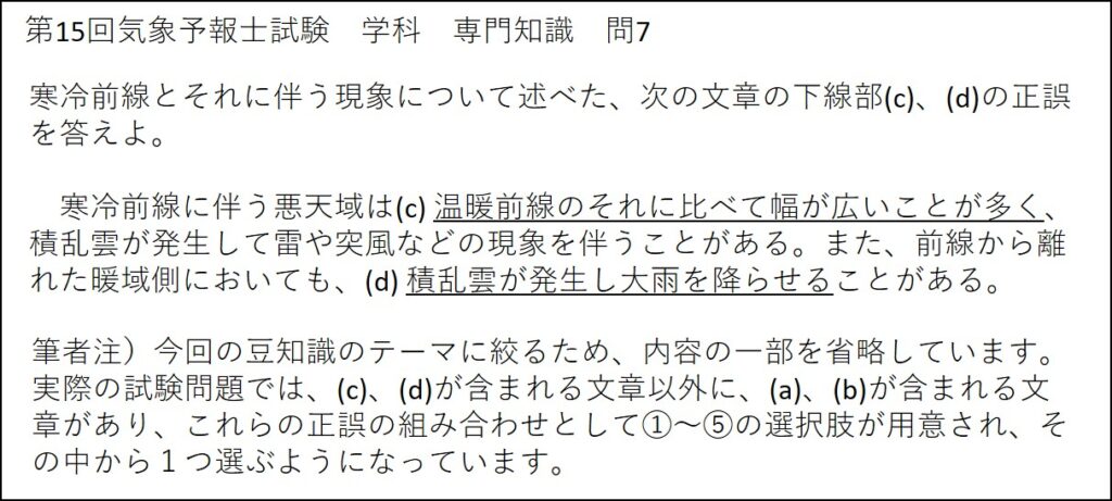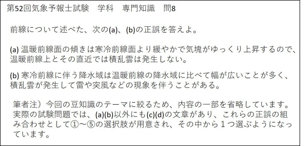 過去の気象予報士試験において、温暖前線や寒冷前線付近の雲域や降水域などに関する問題が出された例を、以下に紹介します。