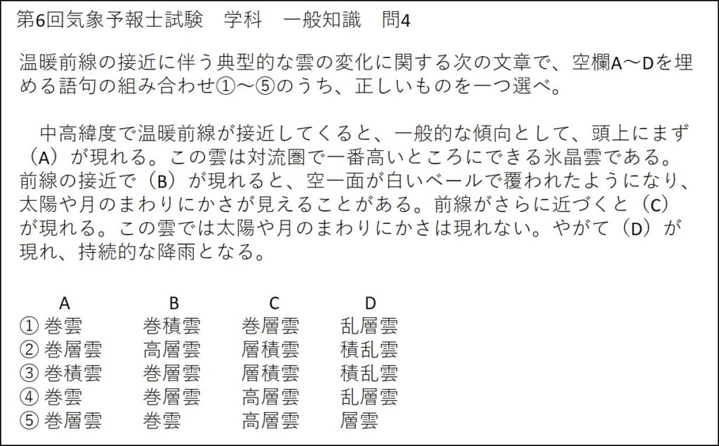 (A)~(D)に関しては、豆知識28において図25を用いて述べたとおり、A巻雲、B巻層雲、C高層雲、D乱層雲となります。よって、正解は④となります。