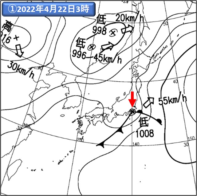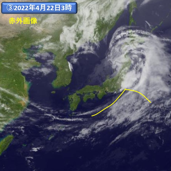 図4 2022年4月22日3時の地上天気図(①)、気象レーダー観測画像(②)、及び気象衛星による赤外画像(③)