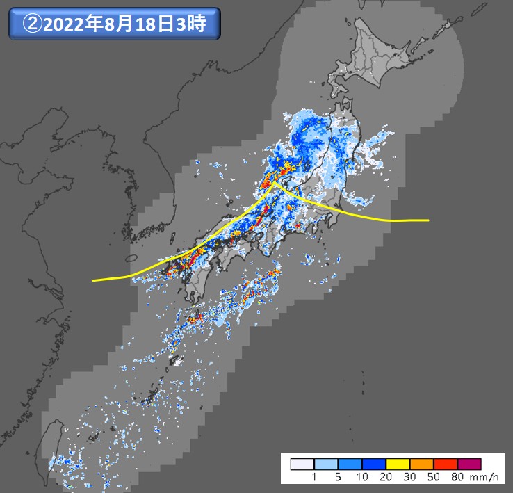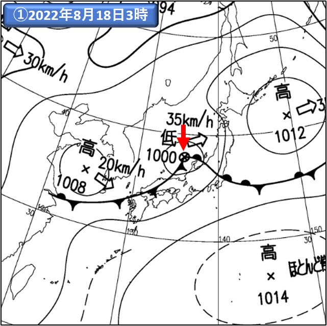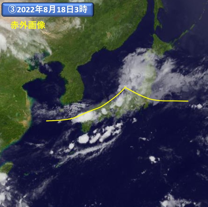 図5 2022年8月18日3時の地上天気図(①)、気象レーダー観測画像(②)、及び気象衛星による赤外画像(③)