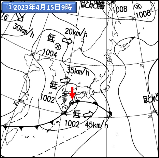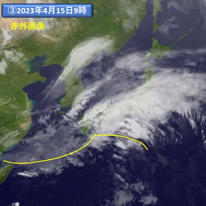 図6 2023年4月15日9時の地上天気図(①)、気象レーダー観測画像(②)、及び気象衛星による赤外画像(③)