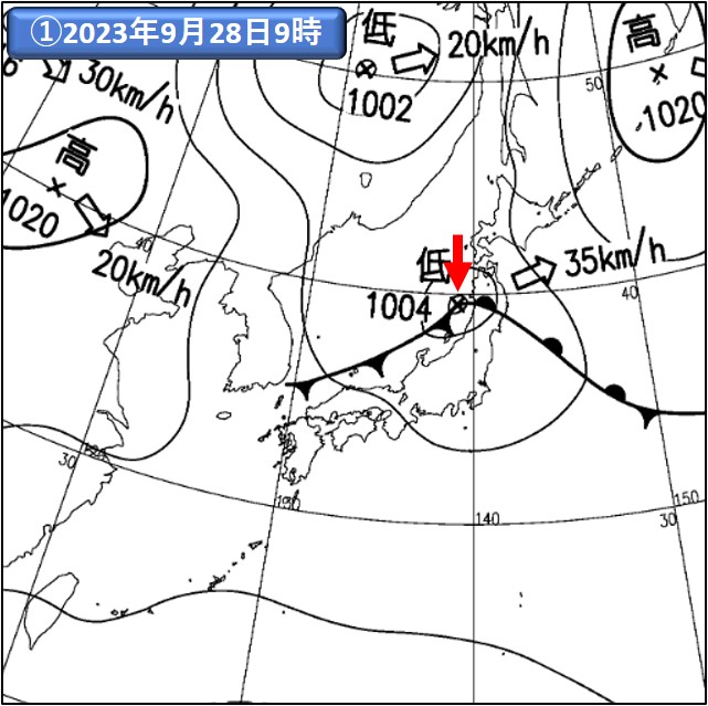 図9 2023年9月28日9時の地上天気図(①)、気象レーダー観測画像(②)、気象衛星による赤外画像(③)及び可視画像(④)