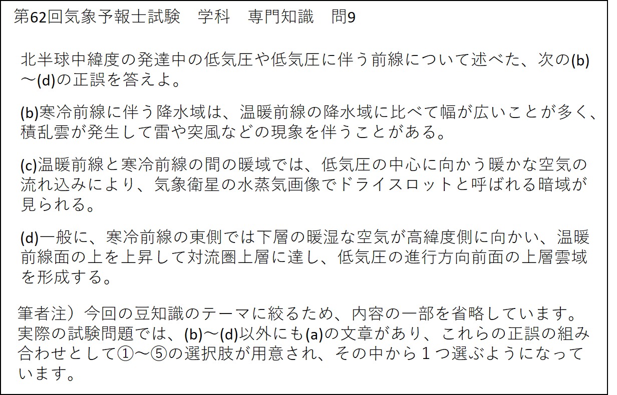 (c)に関しては、豆知識13で述べたとおり、発達中の低気圧の後面では乾燥した寒気が下降しながら流入し、さらに低気圧が最盛期となって閉塞が始まる段階では、この乾燥(Dry)した空気の流入によって、低気圧の後面から中心付近に巻き込むように、細長い溝(Slot)状のドライスロット(Dry Slot)と呼ばれる領域が形成されます。よって、問題文(c)は、誤りです。