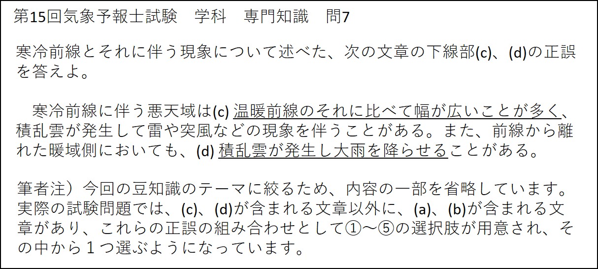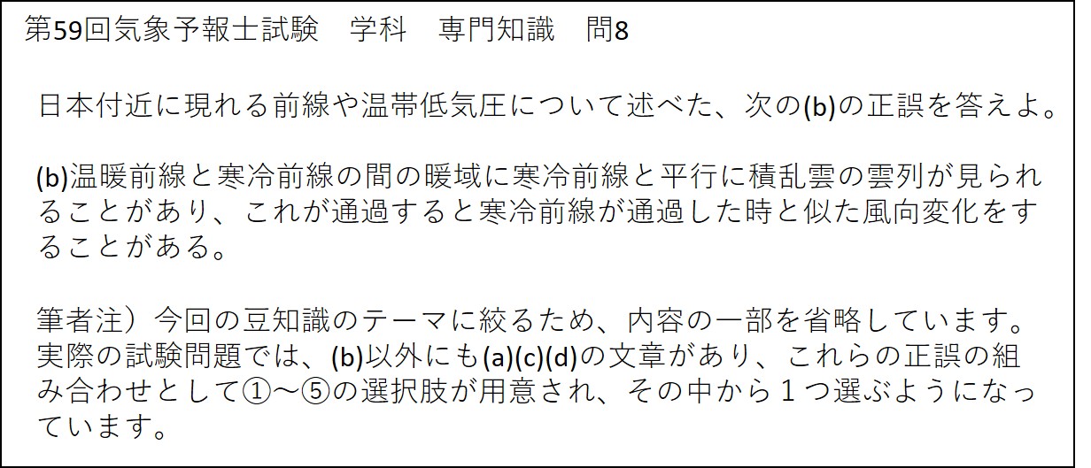 (b)に関しては、図1(上段)を用いて述べたとおり、暖域に寒冷前線と平行に積乱雲の雲列が見られることがあり、これが通過すると寒冷前線が通過した時と似た風向変化をすることがあります。よって、問題文(b)は、正しいです。