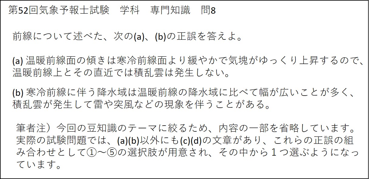 (a)に関しては、図1(下段)を用いて述べたとおり、暖気(高温多湿な空気)の流入が顕著な場合、温暖前線付近であっても積乱雲が発生することがあります。よって、問題文(a)は、誤りです。