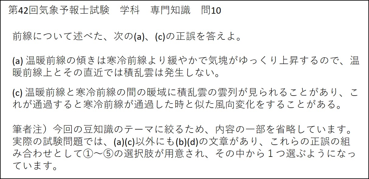 過去の気象予報士試験において、温暖前線や寒冷前線付近の雲域や降水域などに関する問題が出された例を、以下に紹介します。