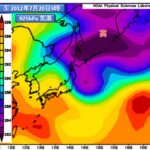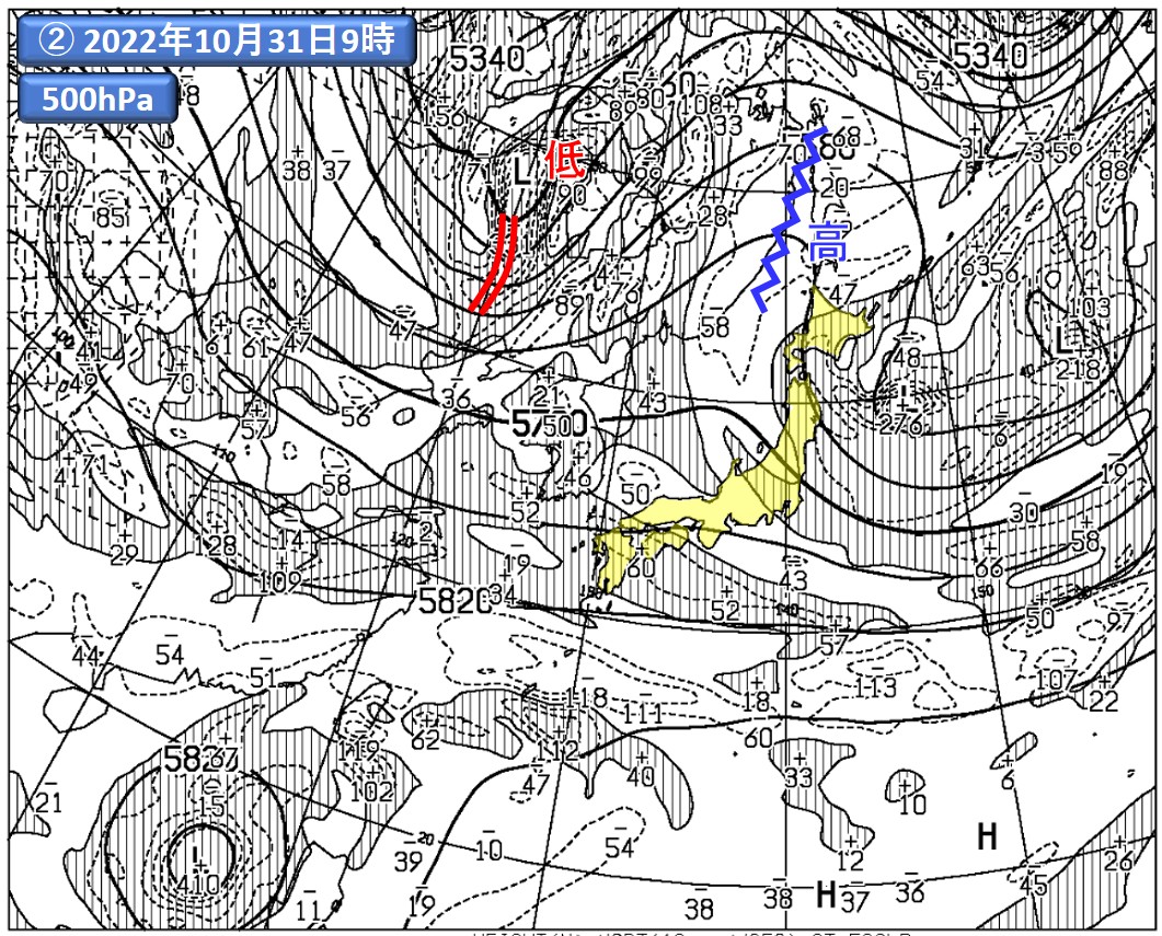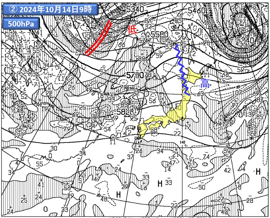 ②:気象庁の数値予報モデルによる予測値(初期値)。上空の気圧の尾根(リッジ)の大まかな位置を青のギザギザ線、上空の気圧の谷(トラフ)の大まかな位置を赤の二重線で示した。本図の見方や渦度については、豆知識10を参照。