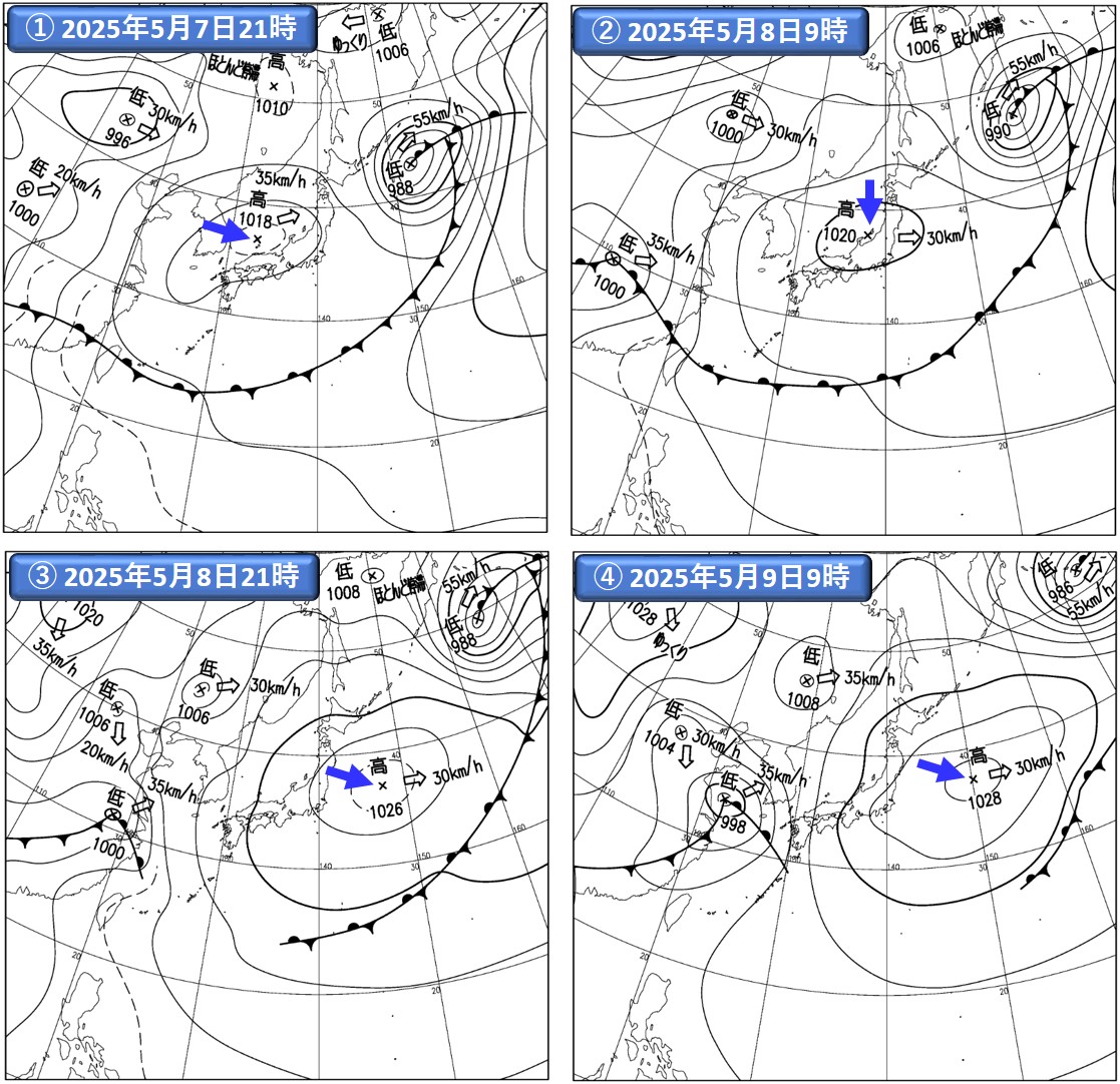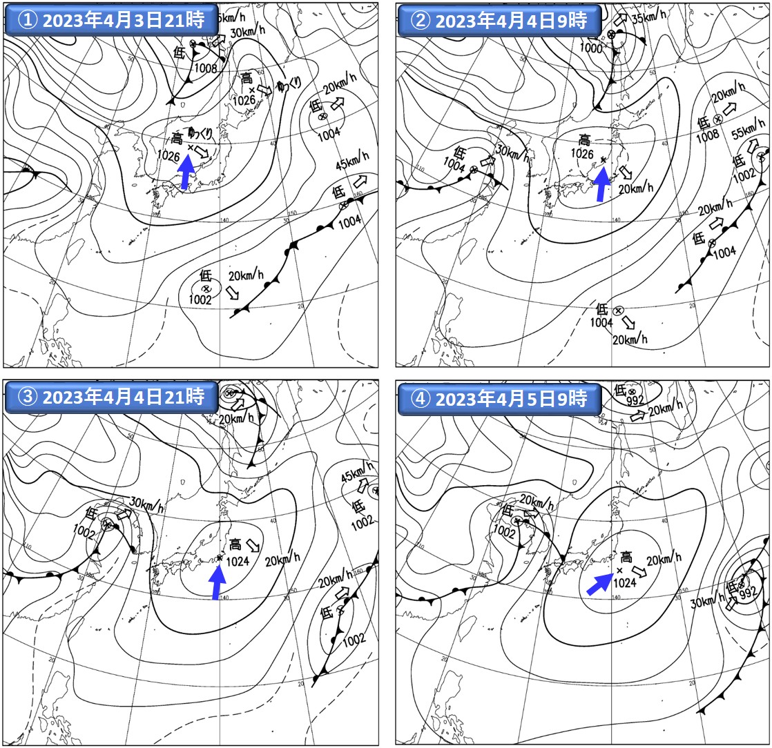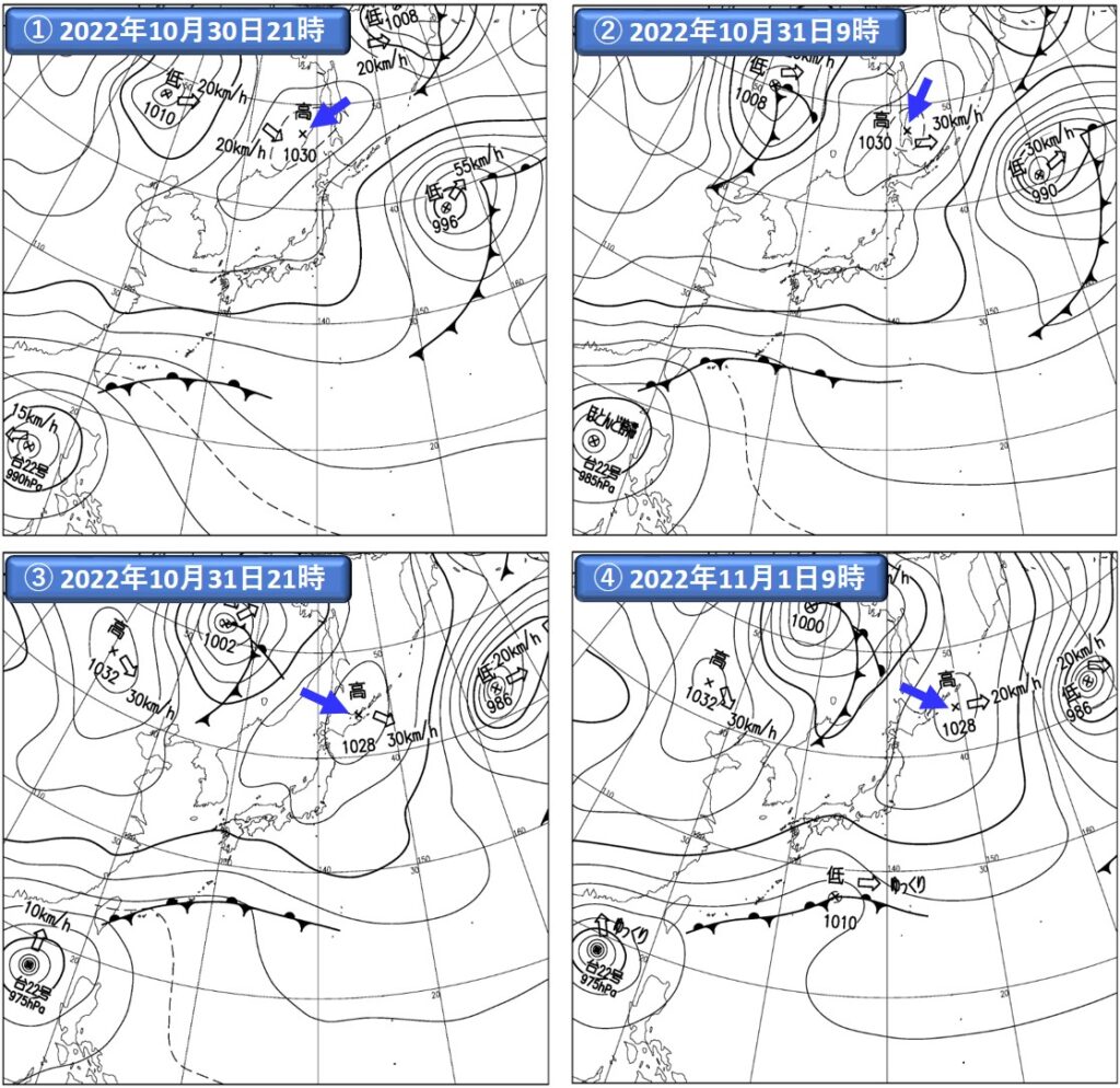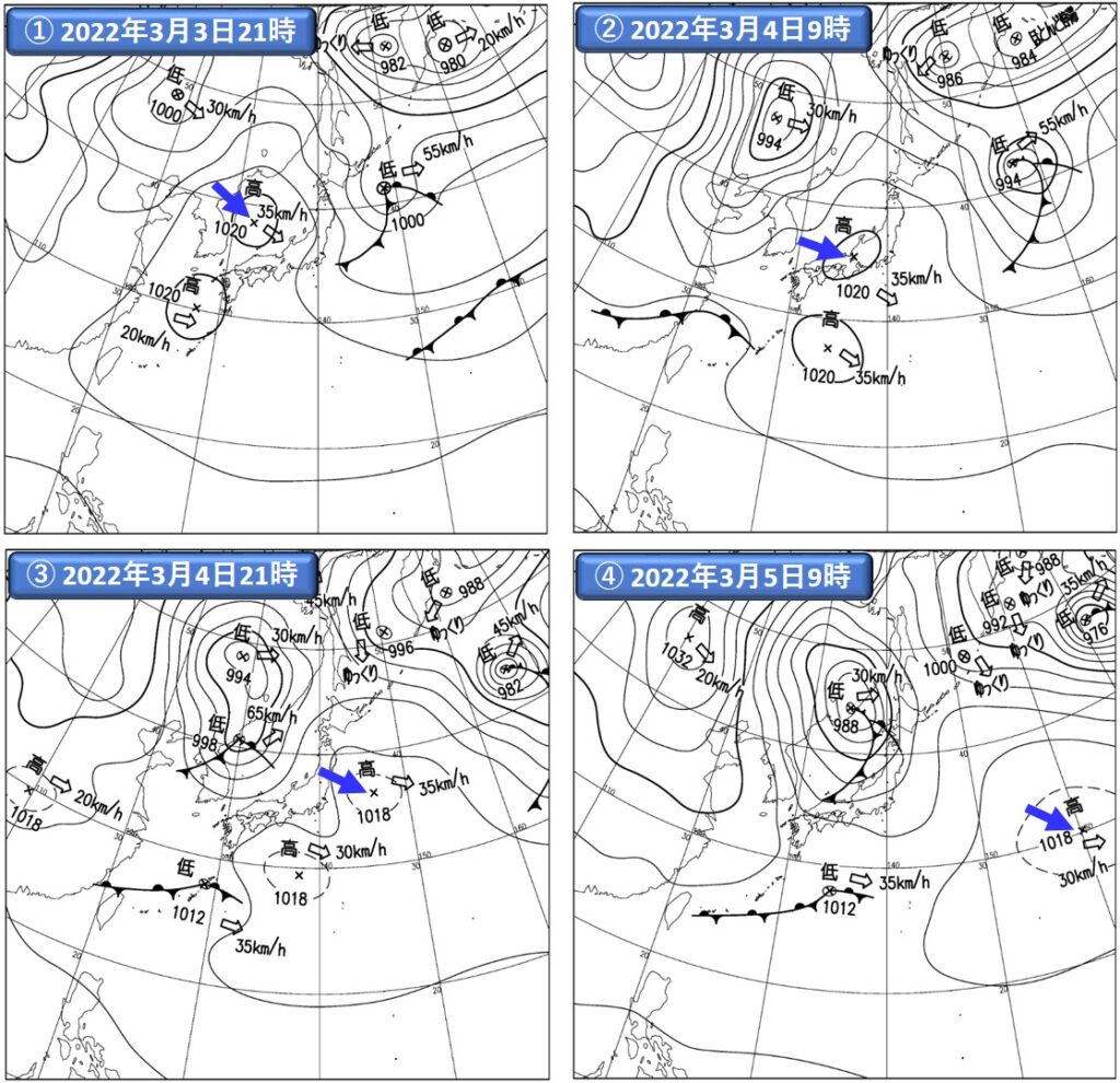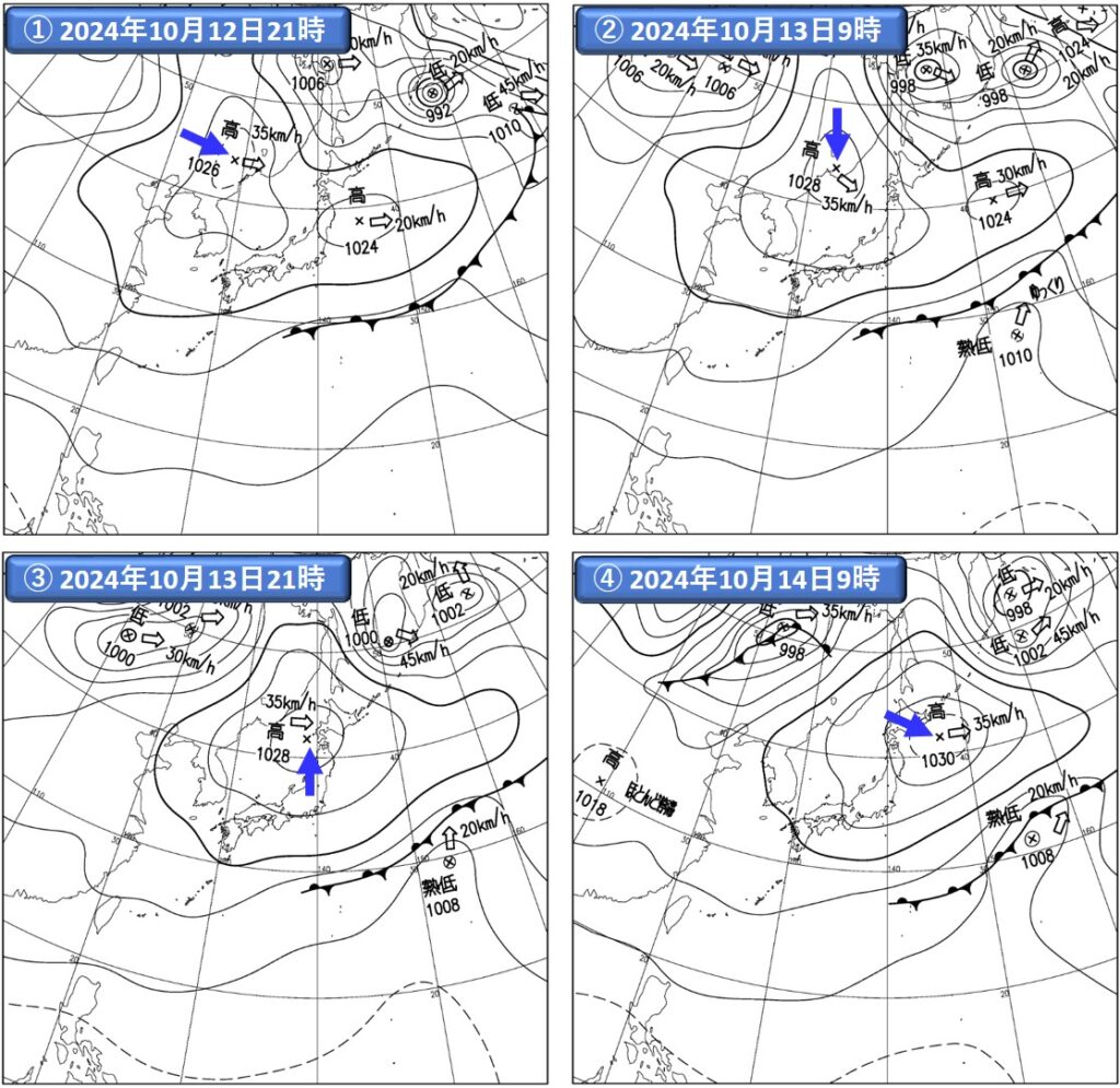 注)①~④は気象庁提供の地上実況天気図(速報天気図)。注目する高気圧の中心位置に、青の矢印を記入した。
