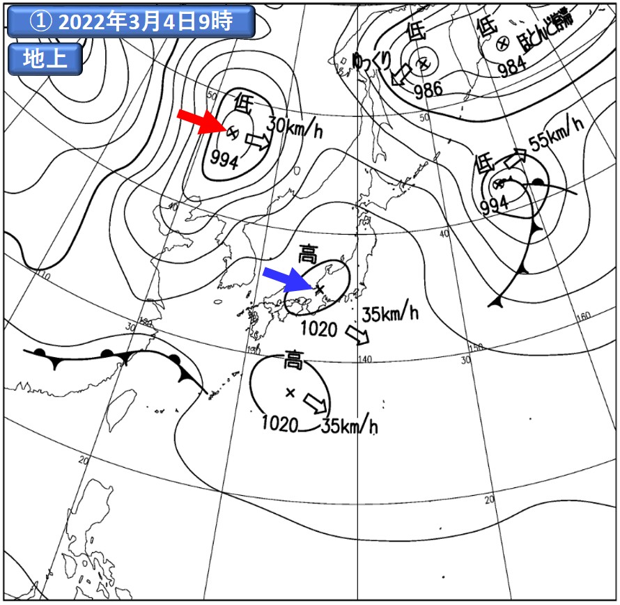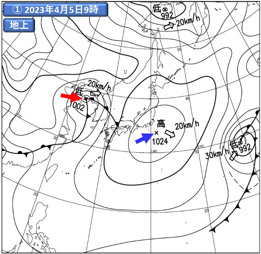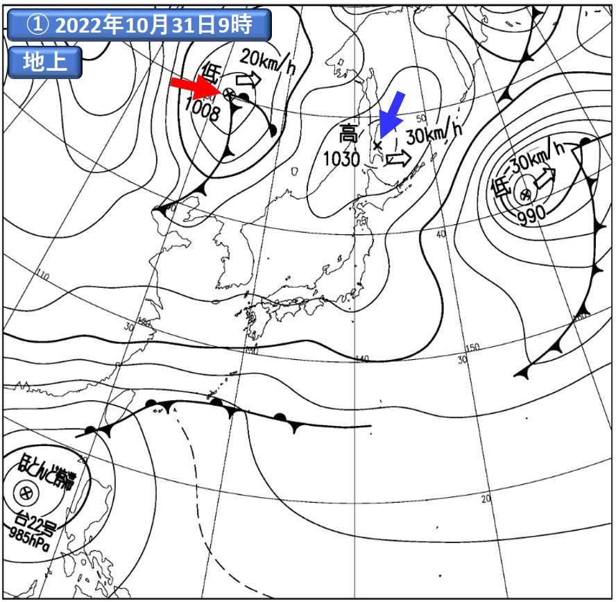 注)①:気象庁提供の地上実況天気図(速報天気図)。注目する高気圧に青、低気圧に赤の矢印をそれぞれ記入。