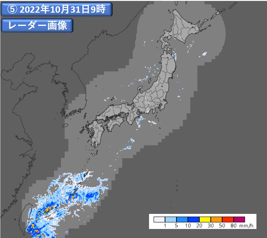 ⑤:気象レーダー(いわゆる雨雲レーダー)観測に基づく換算降水強度(気象庁提供)。