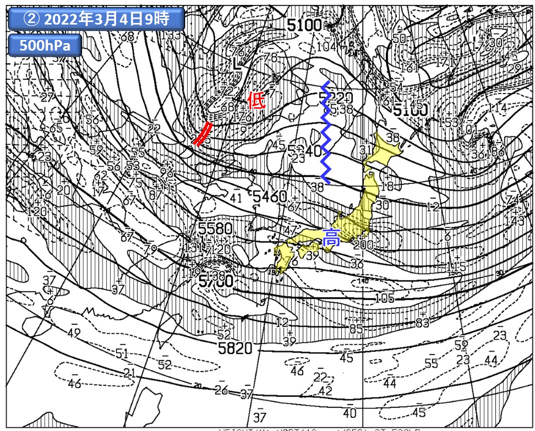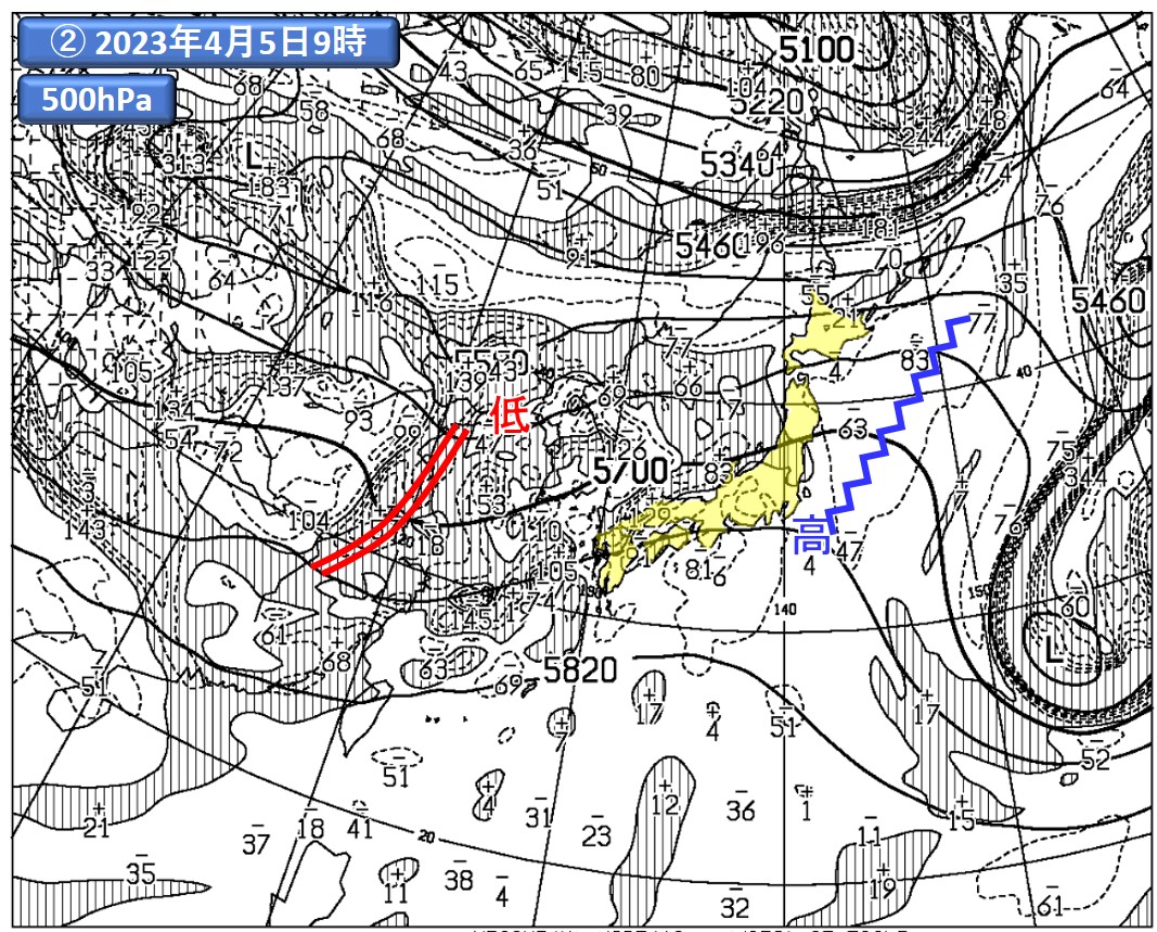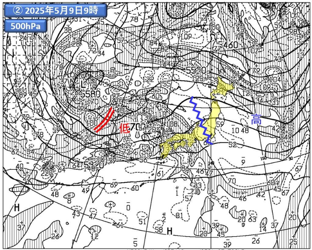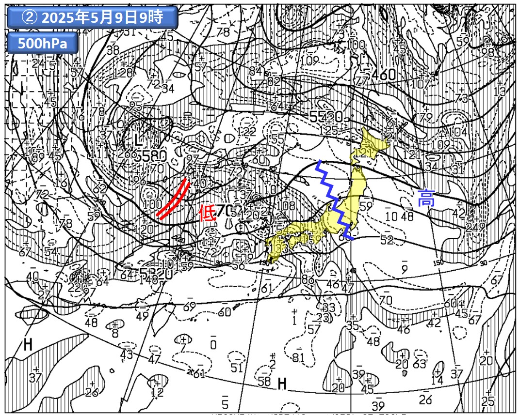 まずは2025年5月9日9時の事例に関し、図7をご覧ください。地上天気図(①)を見ると、移動性高気圧が日本の東(青の矢印)、温帯低気圧が黄海付近(赤の矢印)に位置しています。次に、500hPaの解析図(②)。地上の高気圧に対応するリッジ(青のギザギザ線)、地上の低気圧に対応するトラフ(赤の二重線)が確認できます。この点は、図6(青の破線で囲った部分)の配置と似ていますね。