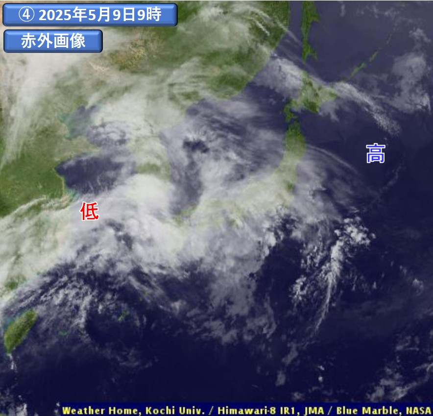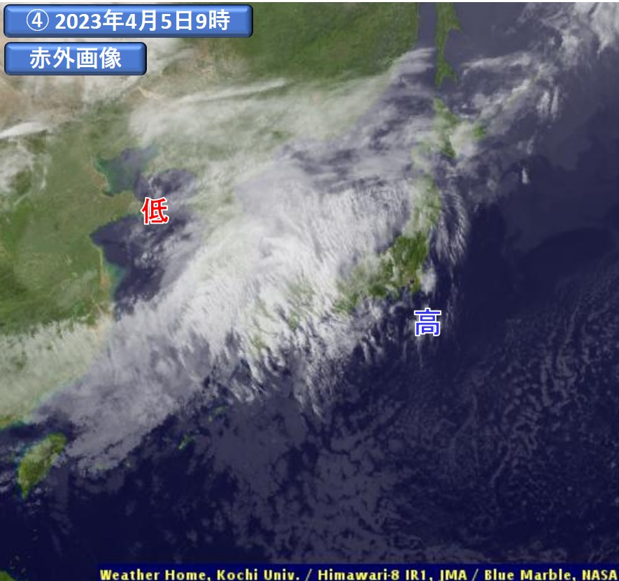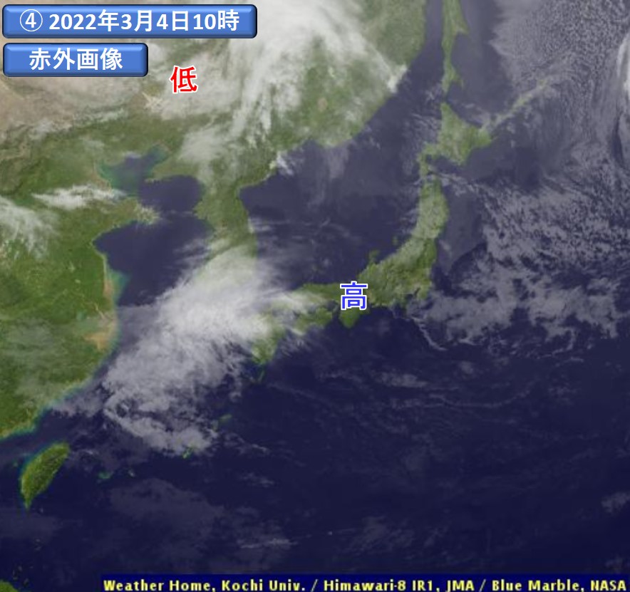 一方、東日本では、可視画像(③)で暗く写り一部透けて見えること、赤外画像(④)で白く写っていることから、主に薄い上層雲が広がっていると判断できます。近畿・中国・四国地方では、可視画像では全般的に白く、赤外画像では白く写り、上層雲よりは厚みのある雲域が広がっています。すなわち、高気圧の後面(西側)では、上・中層雲が広がる傾向を確認できます。