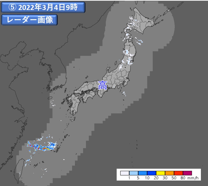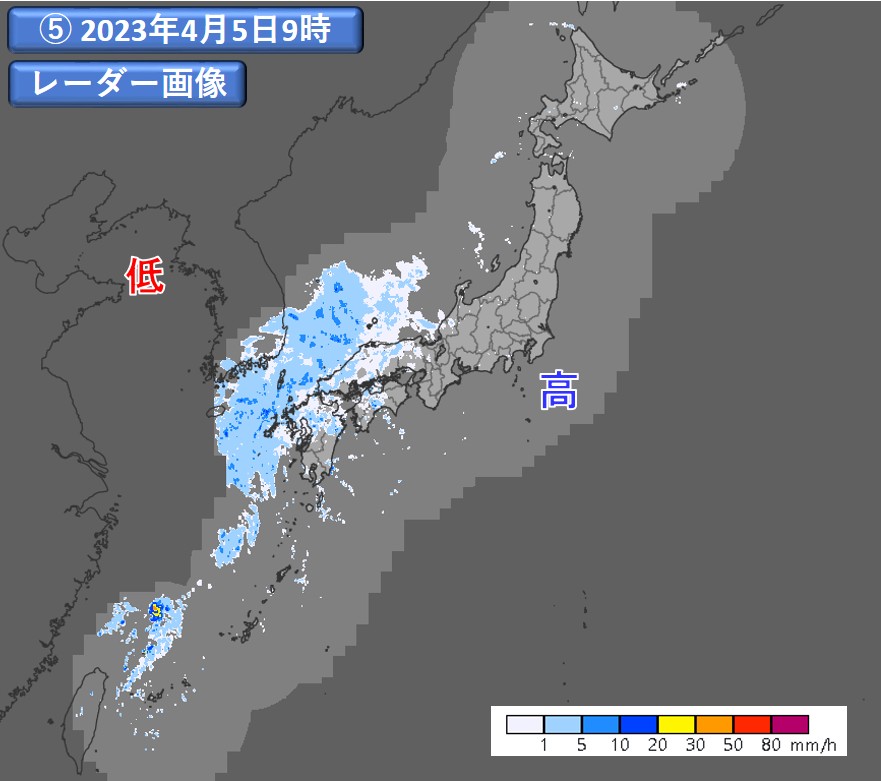 また、東シナ海や九州地方の一部では、可視(③)、赤外(④)ともに白く写り、厚くて雲頂高度の高い雲が確認できます。これらの雲域に対応して降水域も見られます(⑤)。