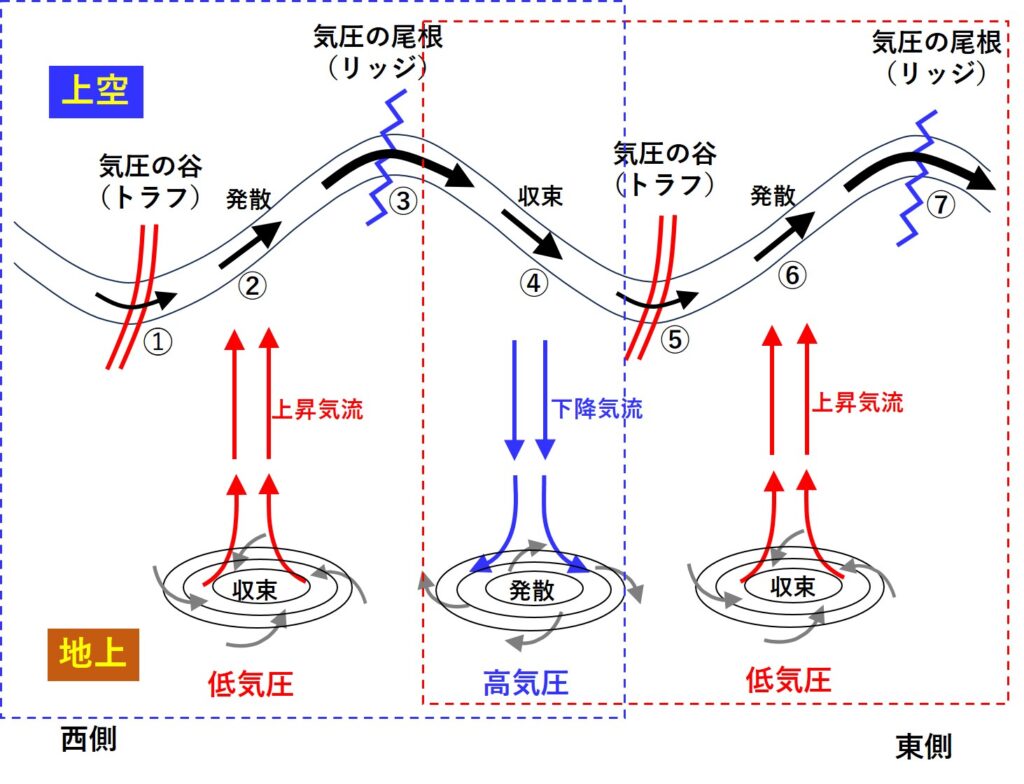 図6 発達しつつある上空の偏西風波動(気圧の尾根・谷)と地上の高・低気圧との関係(模式図)