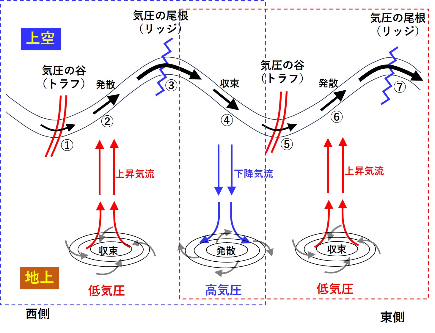 図6をご覧ください。この図は、豆知識9の図1をベースにしながら、「上空①と②、地上の左側の低気圧の内容」を加筆したものです。豆知識9では「低気圧」が主役であったことから、図6の赤の破線で囲った部分を中心に話をしました。今回は、「高気圧」が主役ですので、図6の青の破線で囲った部分に注目してください。この図では、上空の気圧の尾根(リッジ)(③)前面では下降気流が強まり、天気が回復しやすいことを表しています。