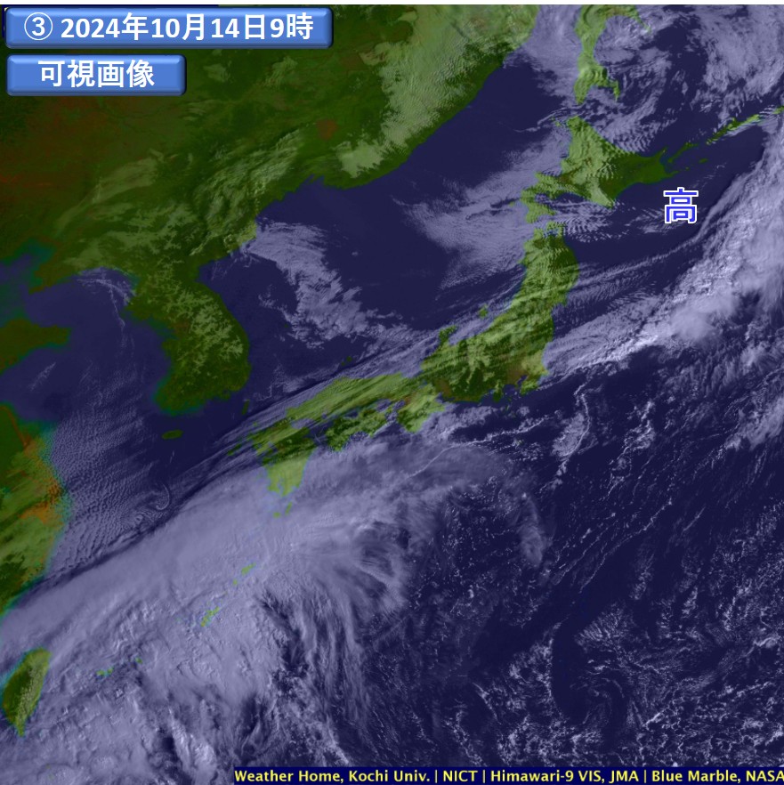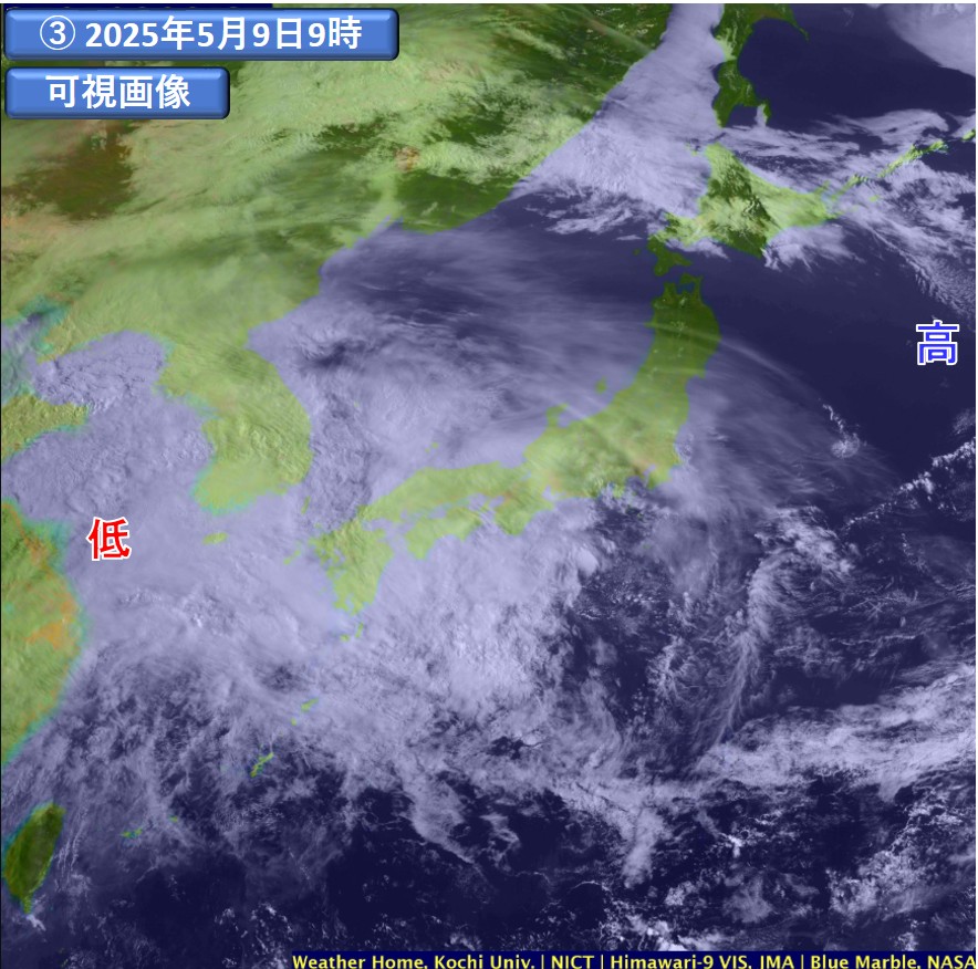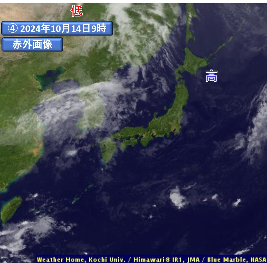 気象衛星画像をみると(③、④)、高気圧の中心付近には雲域がほとんど見られず、晴天域となっています。