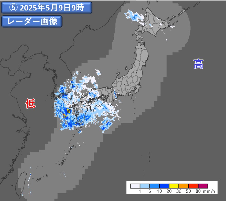 図7 2025年5月9日9時の地上天気図(①)、500hPa 高度・渦度 解析図(②)、気象衛星による可視画像(③)、赤外画像(④)、及び気象レーダー観測画像(⑤)