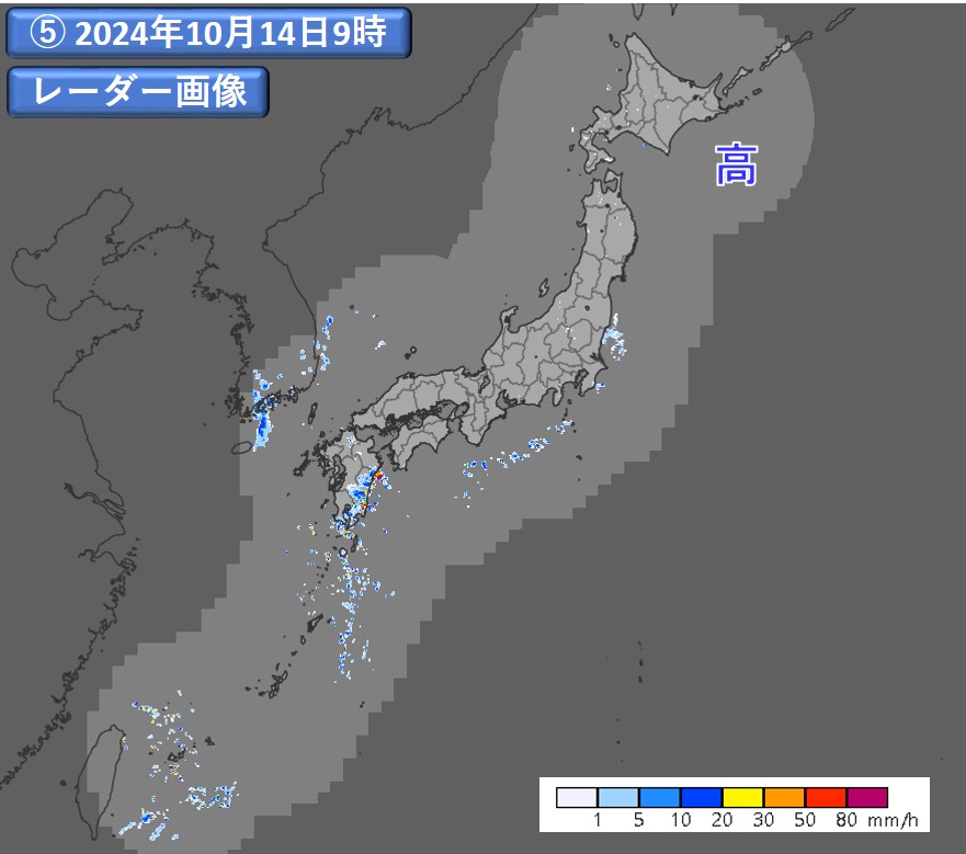 図8 2024年10月14日9時の地上天気図(①)、500hPa 高度・渦度 解析図(②)、気象衛星による可視画像(③)、赤外画像(④)、及び気象レーダー観測画像(⑤)