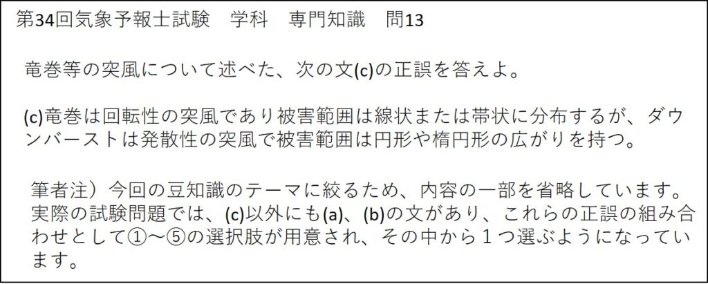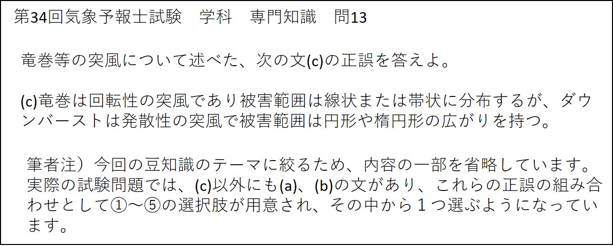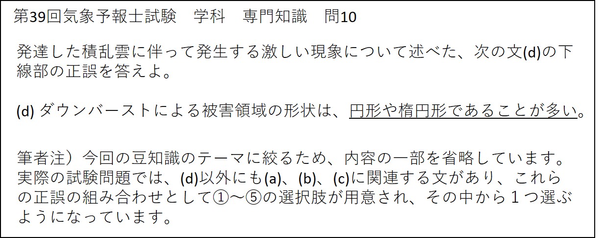 (c)に関しては、前回の豆知識の図10および今回の豆知識の表9を用いて述べたとおり、被害範囲の形状は、竜巻の場合は線状または帯状に、ダウンバーストの場合は、円形や楕円形となる特徴があります。よって、問題文(c)は、正しいです。